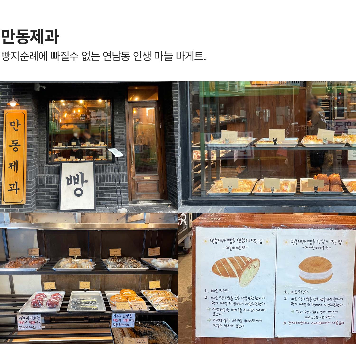 만동제과는 연남동 빵지순례를 하는 이들에게 빼놓을 수 없는 명소입니다. 특히 마늘바게트로 유명한 이곳은 서울 유명 빵집 중에서도 단연 돋보이는 존재감을 자랑합니다.