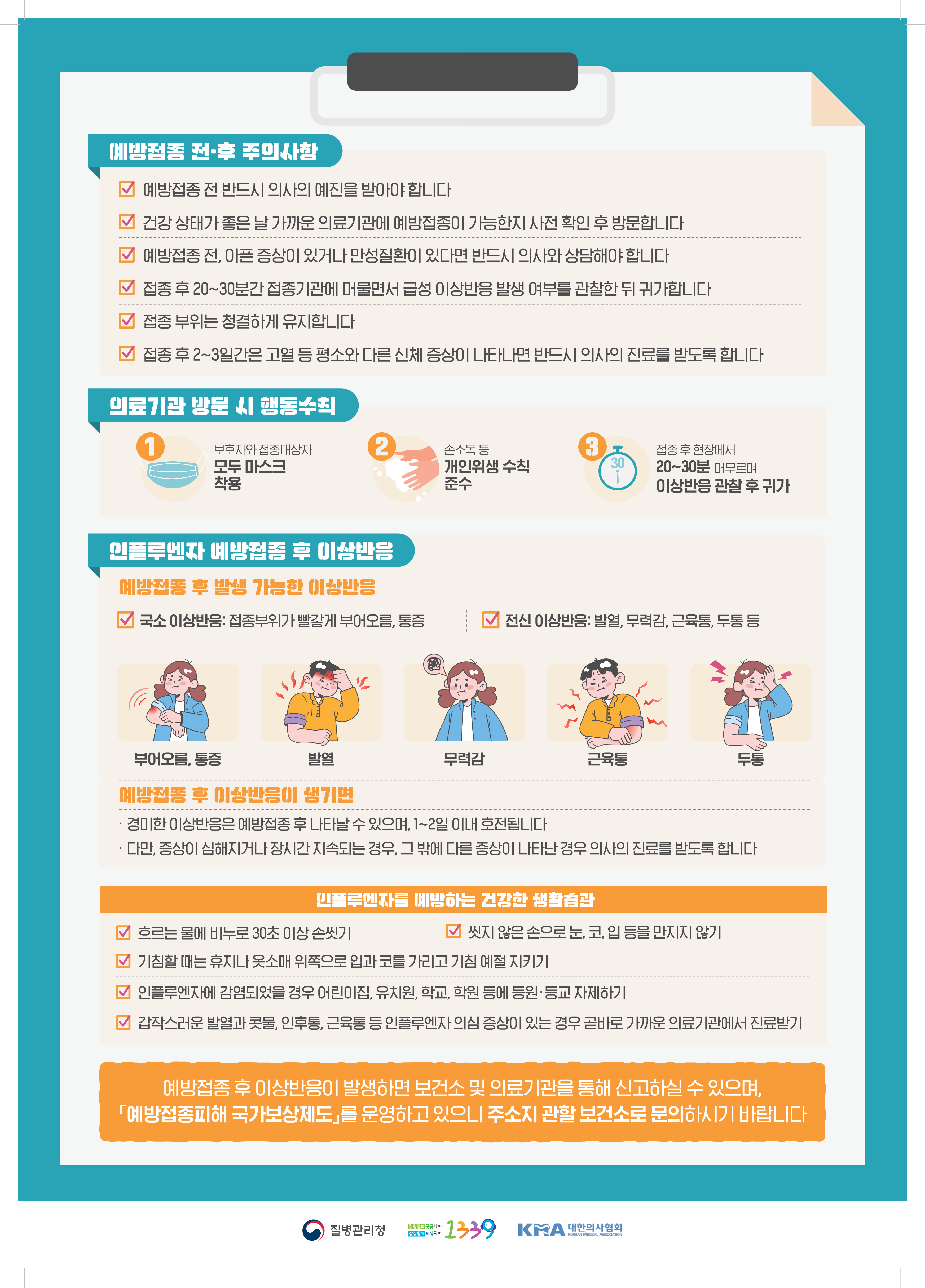 접종 후에는 15~30분 정도 의료기관에서 이상 반응 여부를 관찰하는 것이 좋습니다. 독감 예방접종 기관은 질병관리청 홈페이지나 보건소 홈페이지에서 확인할 수 있습니다.