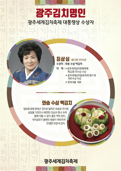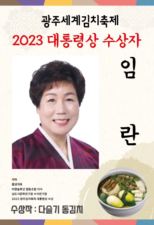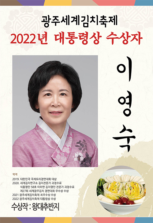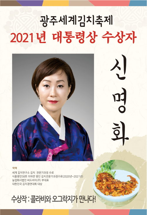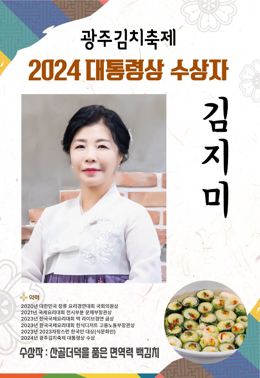 농림축산식품부 장관상은 최행화 씨의 '홍갓 김치'가, 문화체육관광부 장관상은 박은희 씨의 '삼향 보따리 해물 물김치'가 수상했습니다. 광주시장상은 김영준 씨의 '토종동과 말랭이석박지'와 장혜진 씨의 '무 황태 보쌈김치'가 공동 수상하는 영예를 안았습니다.