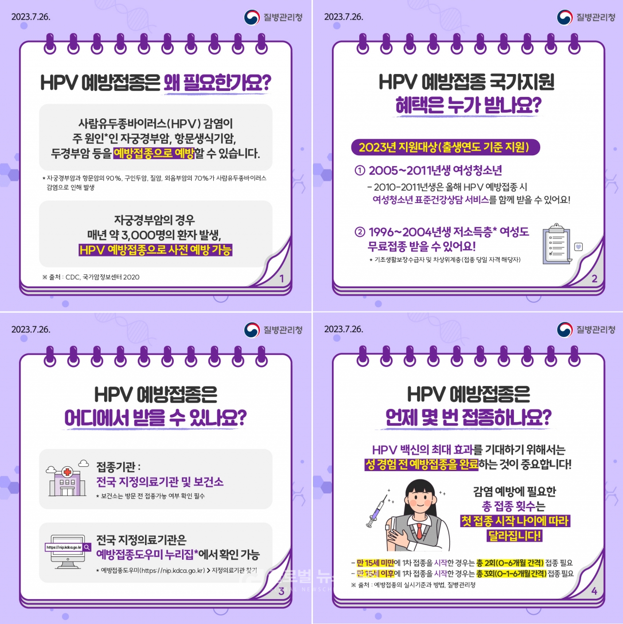 따라서 15세 생일 전에 첫 접종을 받는 것이 접종 횟수를 줄일 수 있는 방법입니다. HPV 백신 무료접종을 통해 효과적으로 암 예방을 할 수 있으니, 해당 연령대라면 꼭 접종을 받으시기 바랍니다.